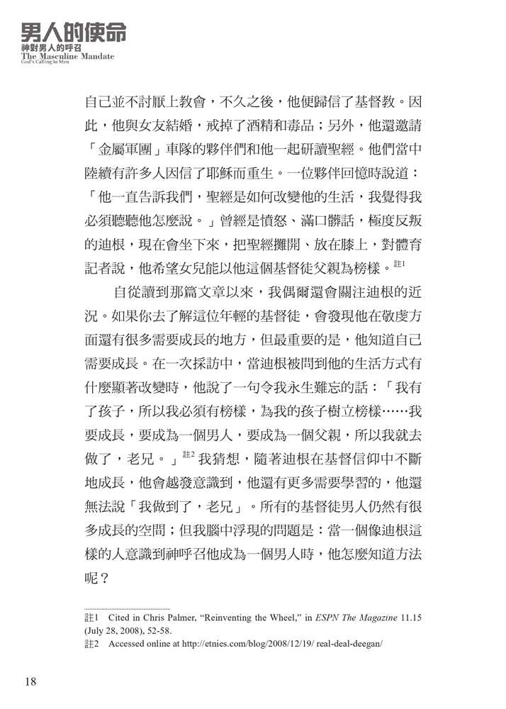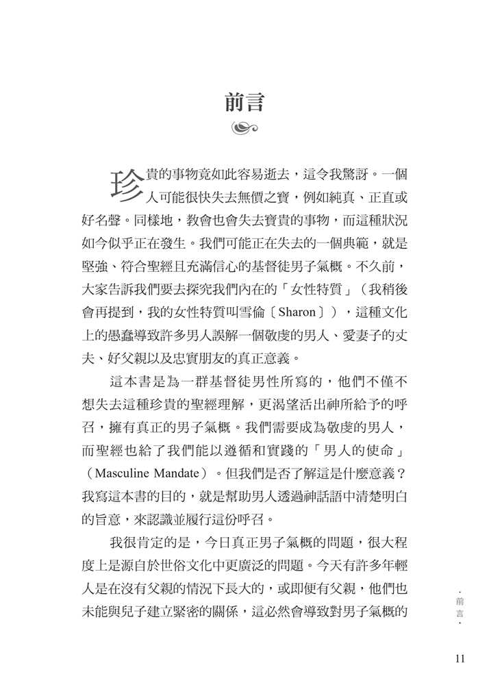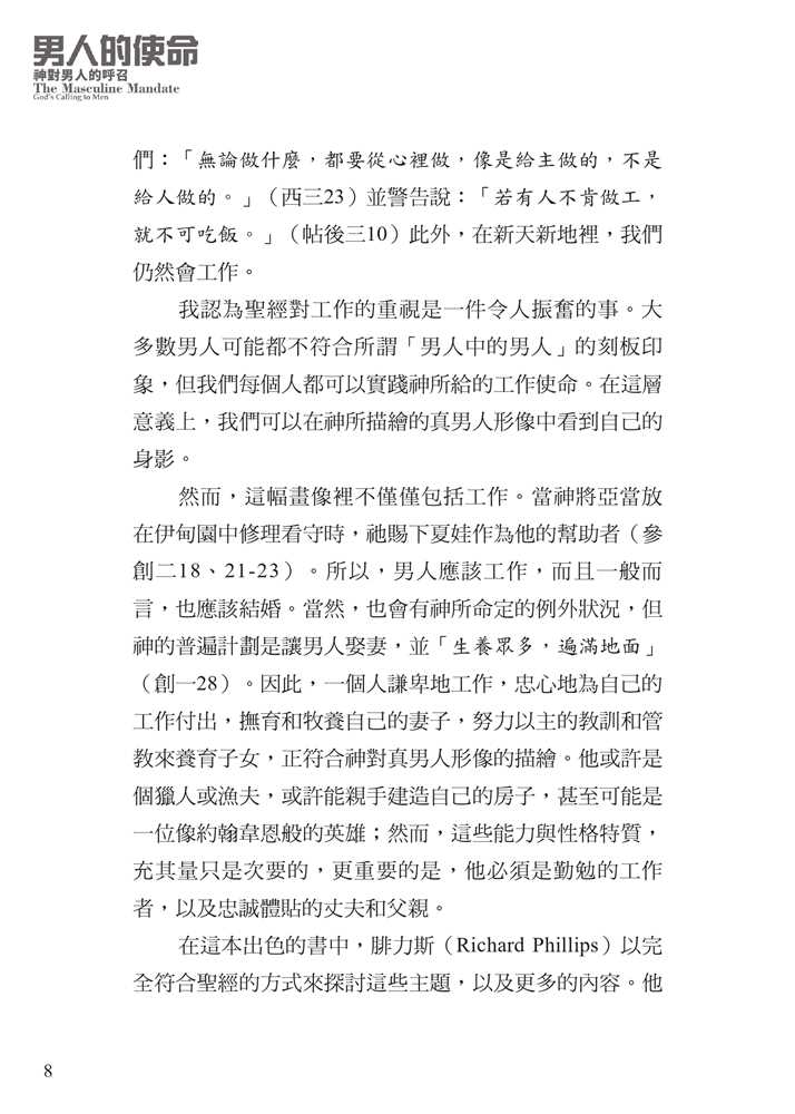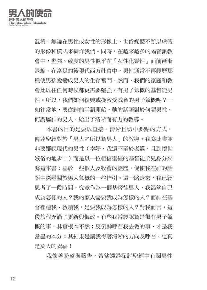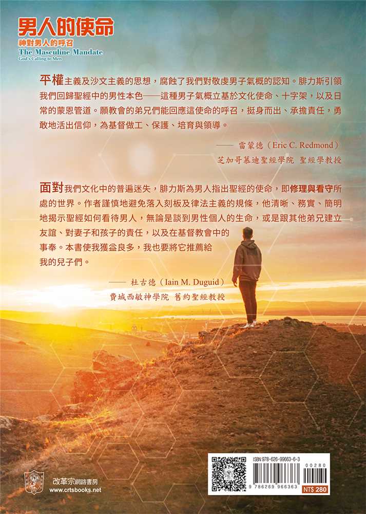 平權以及沙文主義的思想,腐蝕了我們對敬虔男子氣概的認知。 面對文化中的普遍迷失,作者引領我們回歸聖經中的男性本色──這種男子氣概立基於文化使命、十字架,並日常的蒙恩管道,指明男人的使命就是修理與看守所處的世界。他謹慎避免落入刻板及律法主義的規條,清晰、務實、簡明地揭示聖經如何看待男人,無論是談到男性個人的生命,或是跟其他弟兄建立友誼、對妻子和孩子的責任,以及在基督教會中的事奉。