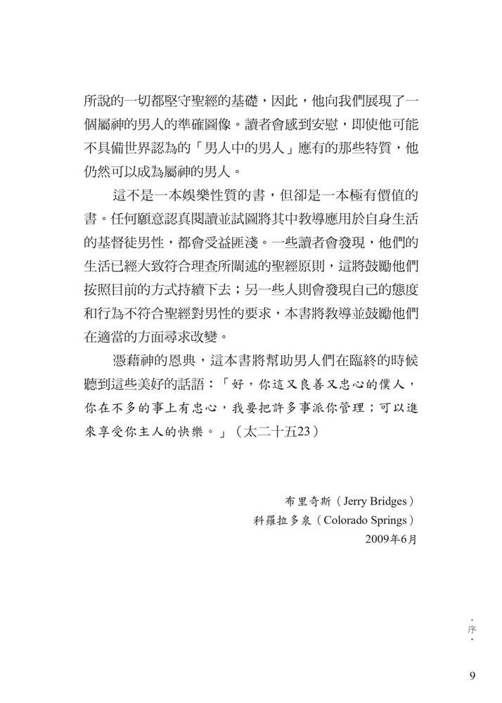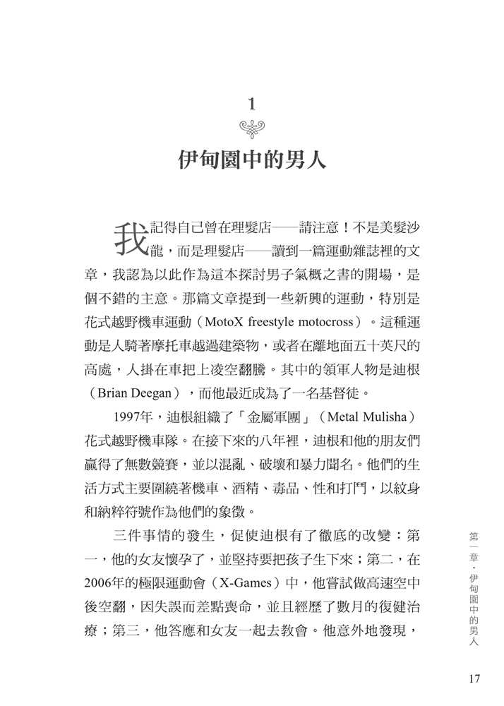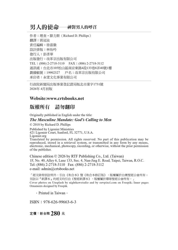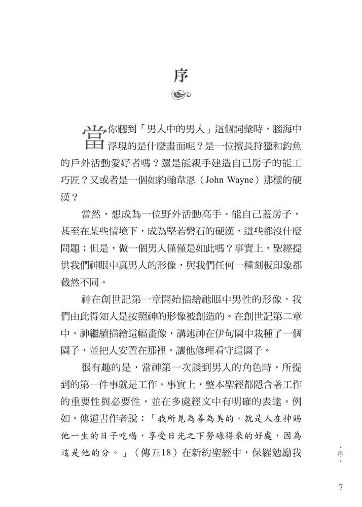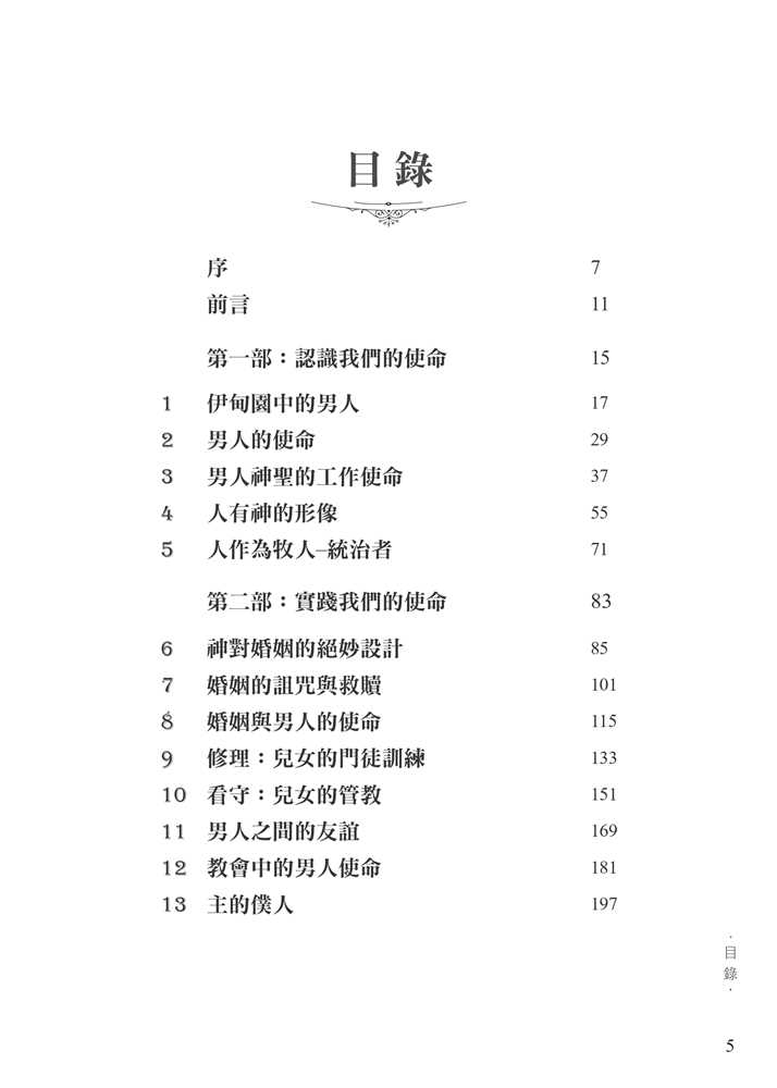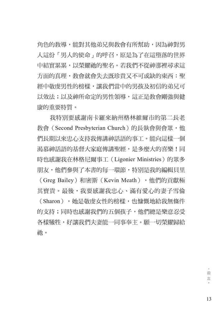 平權以及沙文主義的思想,腐蝕了我們對敬虔男子氣概的認知。 面對文化中的普遍迷失,作者引領我們回歸聖經中的男性本色──這種男子氣概立基於文化使命、十字架,並日常的蒙恩管道,指明男人的使命就是修理與看守所處的世界。他謹慎避免落入刻板及律法主義的規條,清晰、務實、簡明地揭示聖經如何看待男人,無論是談到男性個人的生命,或是跟其他弟兄建立友誼、對妻子和孩子的責任,以及在基督教會中的事奉。